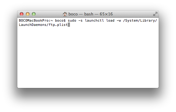 sudo -s launchctl load -w /System/Library/LaunchDaemons/ftp.plist
