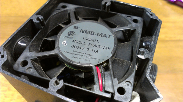 COMET CB25Hに使用されていたのは、「NMB-MAT」というメーカーのFBA06T24Hというファンでした。同じJモデルはもう生産していないようでしたので「24V DCファン 0.11A W60mmXH60mm D15mm」で探したところ同じメーカーの「2406KL-05W-B59」というモデルが手に入りました。PCファンは、12Vなので24Vはちょっと高い(約2~3倍)ですね。白いケーブルは、制御用です。