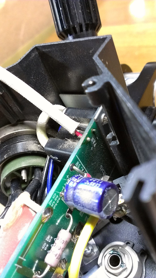 配線は基盤にハンダ付けでした。コンパクトなボディではスペースの都合でコネクタは使えなかったのか、めったに壊れないパーツなのでメンテナンス性を考える必要がなかったのか。真意はわかりませんが、配線がファンに接触するのも問題なので基板部分にハンダ付けし直しました。